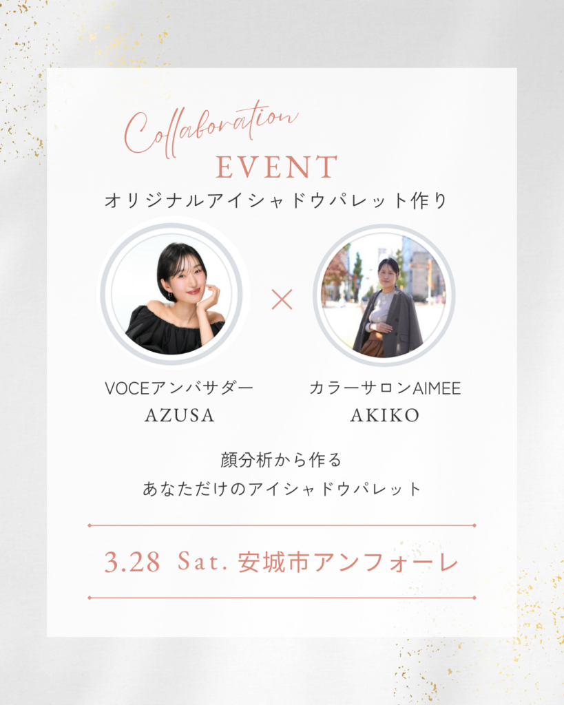 VOCEアンバサダーで、16タイプパーソナルカラーアナリストのazusaさんをサロンにお招きして1日限定で開催するコラボレーションイベントです。